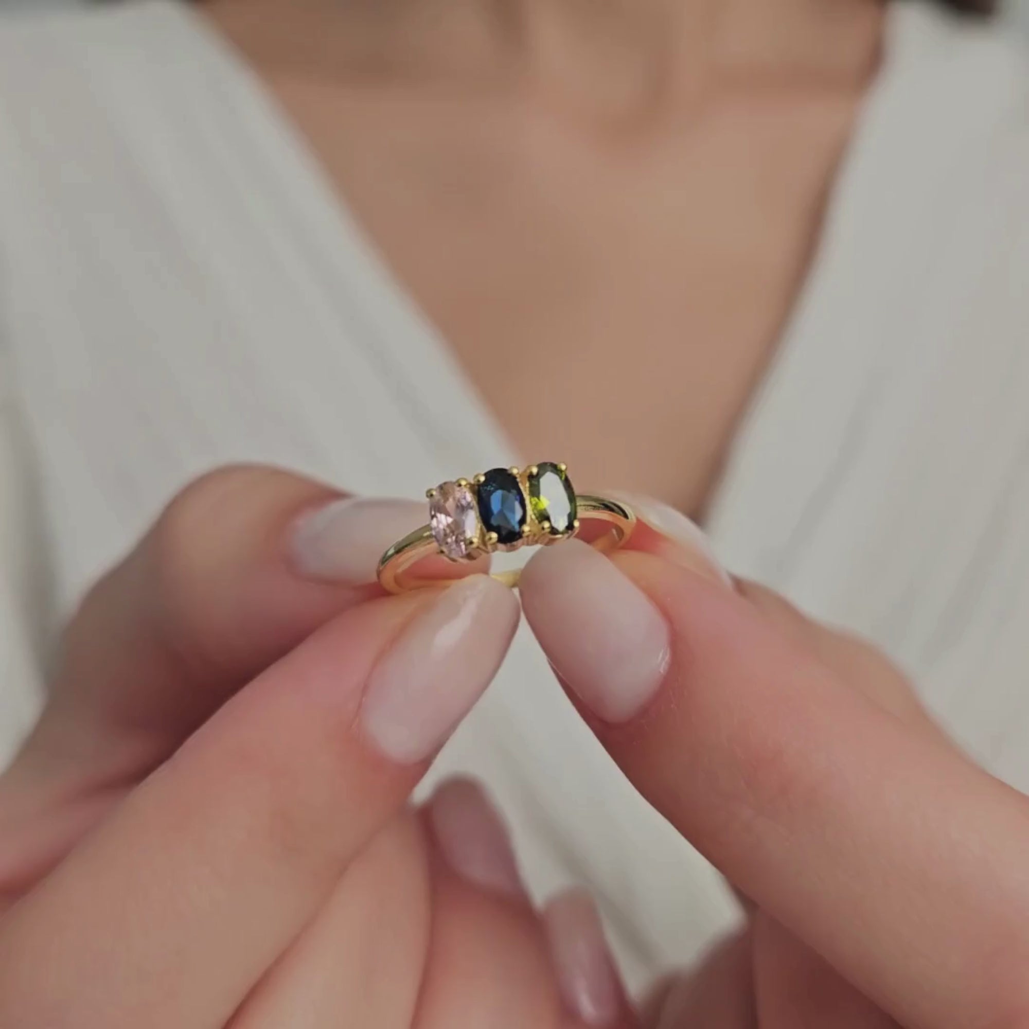 Each ring features a stunning oval-cut gemstone, chosen to represent your birth month, a loved one, or a cherished memory.