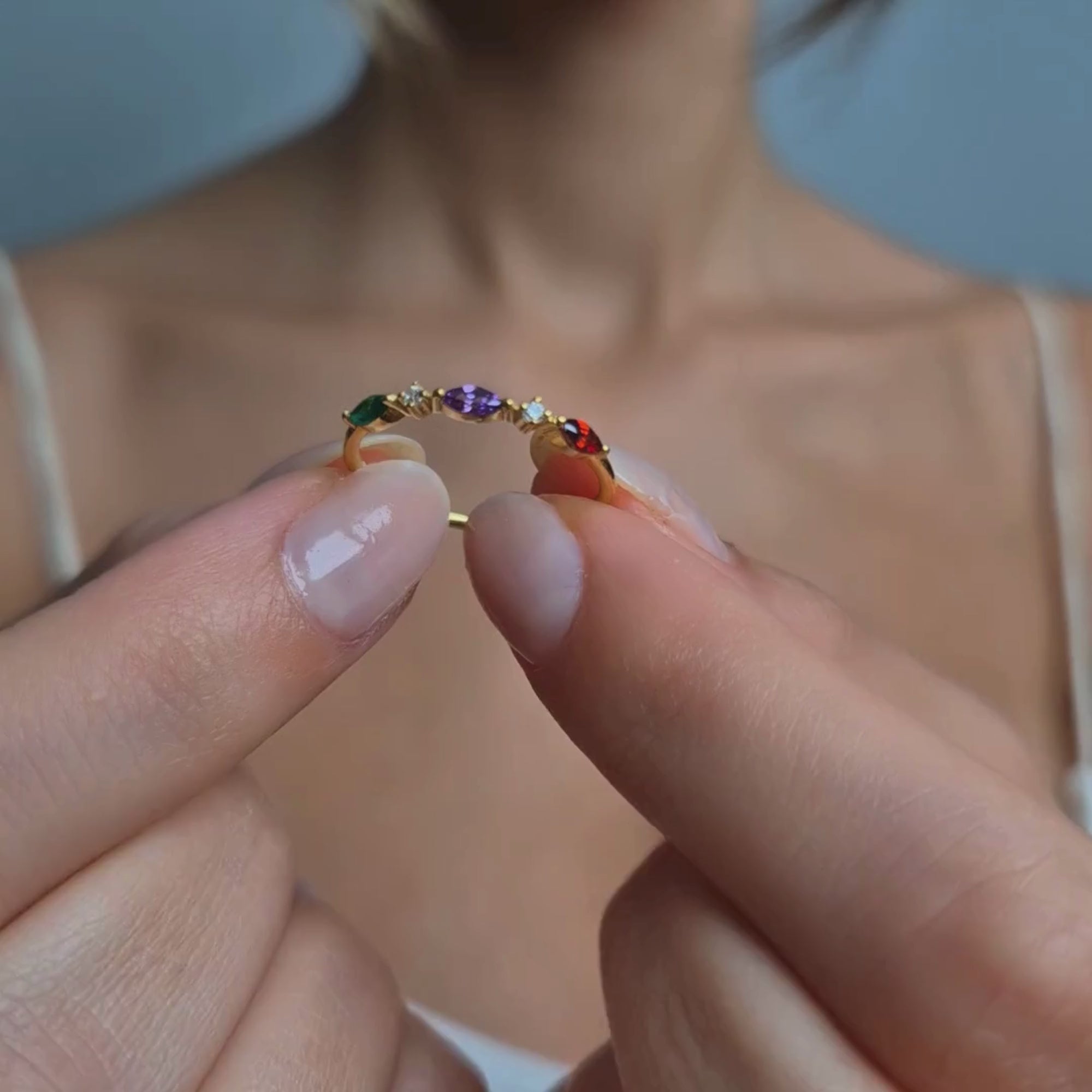 This dainty and colorful ring features up to three custom birthstones, each representing a special person in your life.