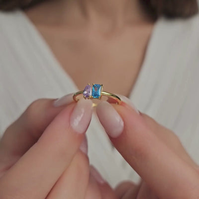 Each ring is crafted with two customizable birthstones in distinct cuts β one Emerald Cut and one Pear Cut, creating an elegant and meaningful symbol of love, friendship, or family.